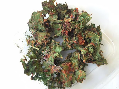 For my snack, I had Somer's Baked Nacho Cheesy Kale Chips, except I didn't follow the directions and bake them. I dehydrated them in my Excalibur dehydrator. Baked kale chips are nice, but in my experience, they don't retain their crunch after a day or so. With the dehydrator, I was able to make a batch large enough to have for snacks for the rest of the month. And they'll stay crunchy all month. The cheesy flavor comes from a homemade sauce made with red bell pepper, cashews, nooch, garlic, and seasonings. And it tastes very cheesy! And garlicky!